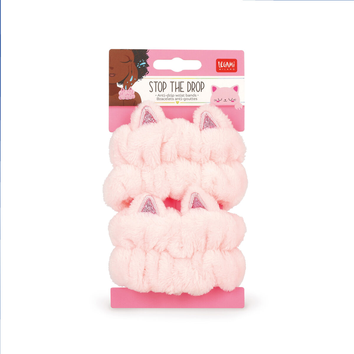 Τα Legami Stop the Drop – Kitty Anti-Drip Wrist Bands είναι το ιδανικό αξεσουάρ για να απολαμβάνεις τη ρουτίνα καθαρισμού και περιποίησης του προσώπου σου χωρίς να στάζει νερό στα χέρια.